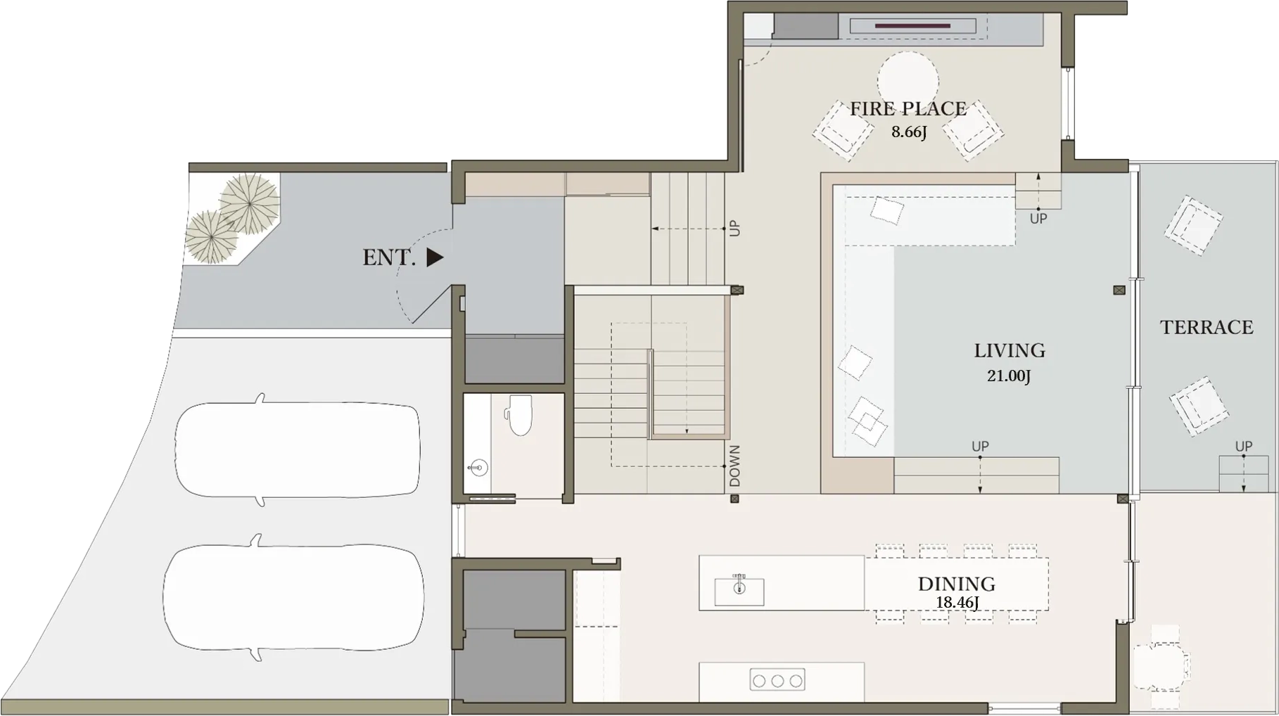 大きな窓から光がふりそそぐ、天井高4mの開放的な空間。床を掘り下げたリビングが、団らんのひとときをゆったりと演出します。また、窓を開け放つとテラスとつながるアウトドアリビングに。暖かな炎に包まれながら語らうファイヤープレイスも大切な人との距離をさらに縮めます。