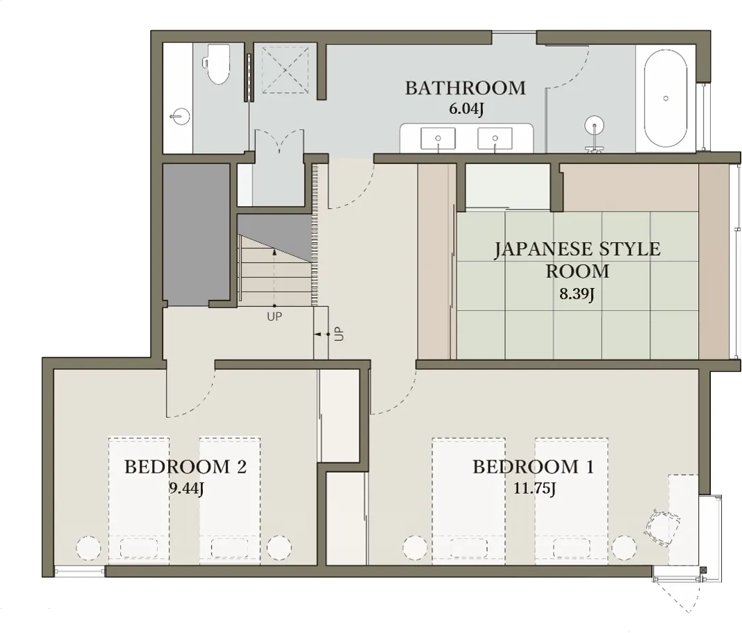 書斎付きのメインベッドルームでは、ワーケーションも可能。ゆったりと過ごせるモダンで落ち着いた和室は、多世代での宿泊にも便利です。